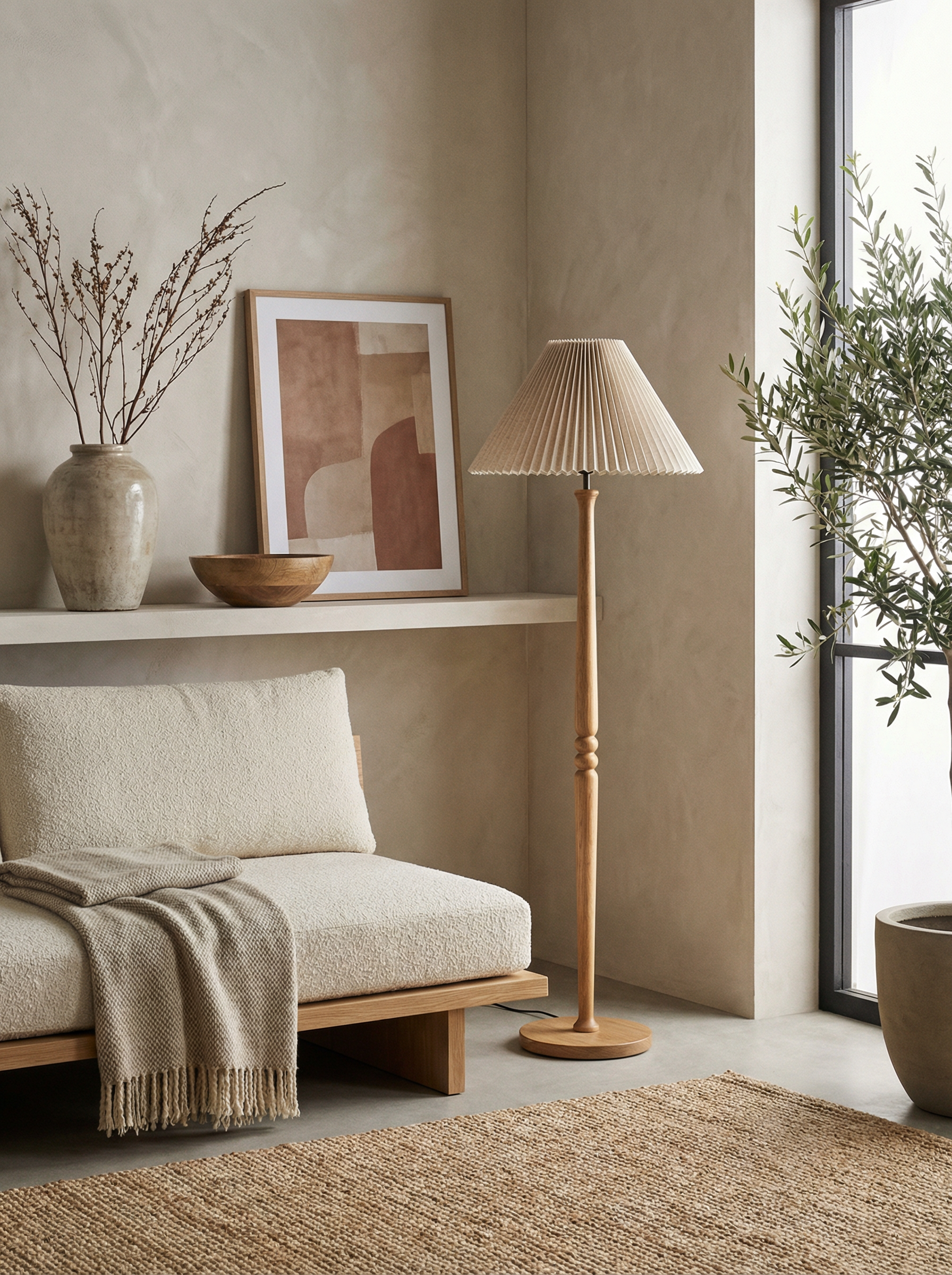 The Japandi Pleated Floor Lamp is a piece that embodies the serenity and harmony of Japandi and Wabi-Sabi styles, a key trend in UK lighting for 2026. With a robust natural wood base and a pleated textured fabric shade, this floor lamp offers a soft, diffused light that creates a tranquil and cozy atmosphere. Its timeless design and organic materials make it the perfect complement for any space seeking a balance between functionality and natural aesthetics.